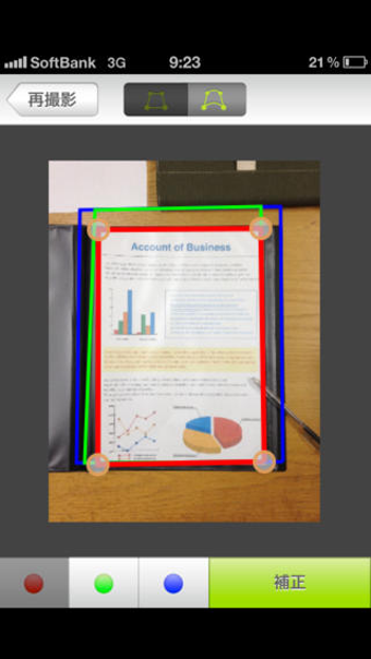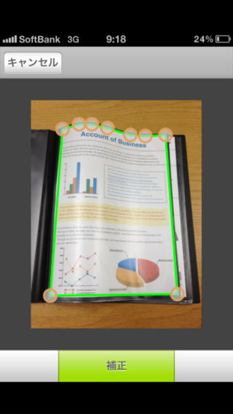 アプリを起動したら専用のSHOT DOCSファイルに入れた書類を、画面に入るように撮影します。自動的に書類の端を認識するので、そのままカメラを合わせ続けるとオートシャッターが作動します。撮影された画像は、自動でトリミング・台形補正などが行われ画面ピッタリに補正されます。ややブレやすいので、何回か試してコツをつかみましょう。