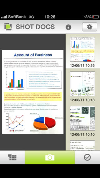 撮影されたデータは時系列順に画面右側にリスト表示され、タッチすると画面左側の大きなプレビュー画面に表示されます。さらに撮ったデータはEvernoteやDropbox 、Google Driveなどのクラウドサービスに共有可能。クラウドに送り済みの書類には各クラウドサービス別に確認マークが表示されるので、どれを同期したか迷わず済みます。そのほか取り込んだ書類は複数を一括してエクスポートもできますし、まとめてメール送信もできます。